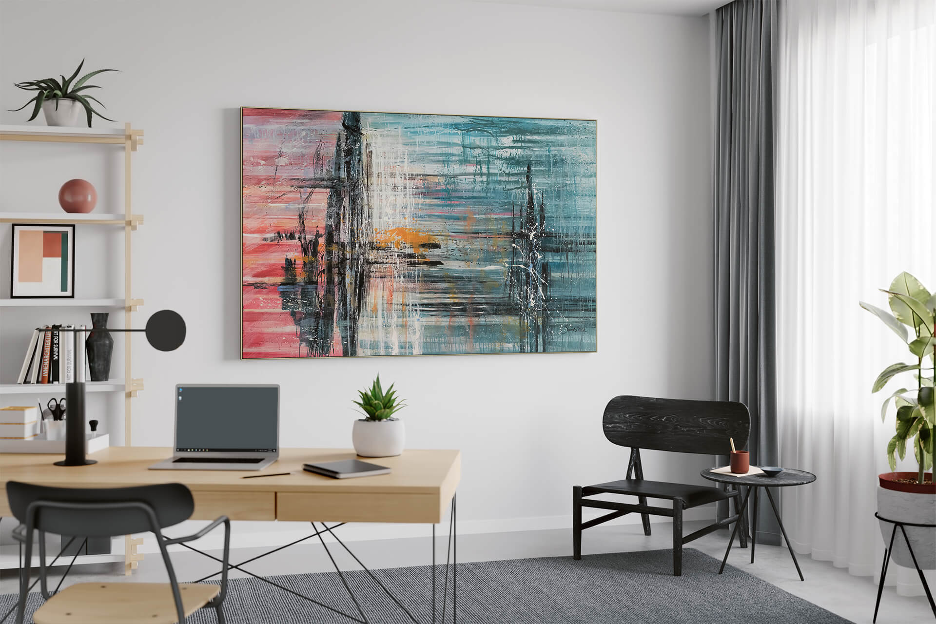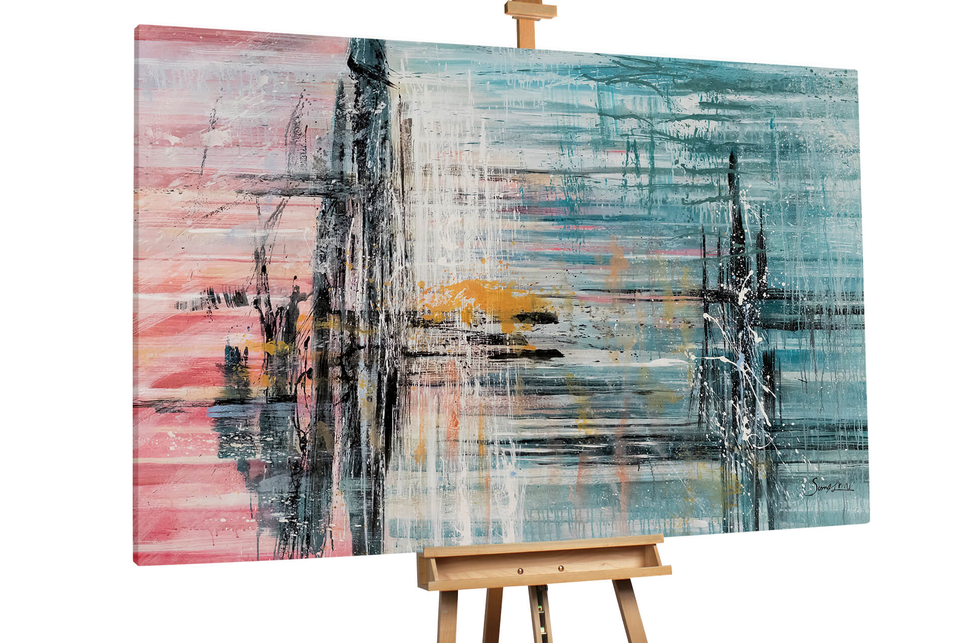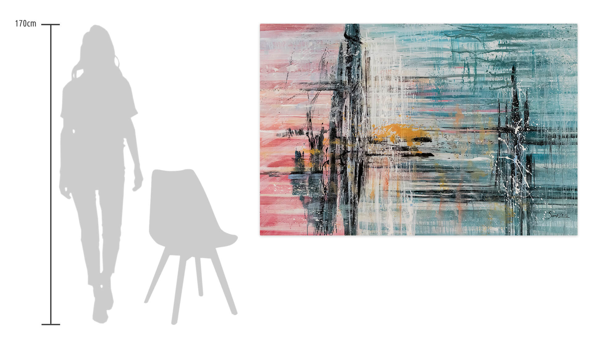 Auspacken. Aufhängen. Freuen! Ihr KunstLoft® Gemälde erhalten Sie in der Größe 90x60cm. Wir verwenden kraftvolle Ölfarben und Leinwände in Profiqualität. Sie sind geruchslos und gesundheitlich absolut unbedenklich. Anders als bei minderwertigen Drucken auf Leinwand können Sie auf unseren Unikaten jeden Pinselstrich fühlen. Ihr Ölbild können Sie sofort aufhängen, da ein praktisches Aufhängesystem angebracht ist. Die Gemälde sind auf 4cm breiten Keilrahmen aus massivem schwedischen Tannenholz gespannt - auf billige, sich verbiegende MDF-Rahmen verzichten wir. Zur leichten Ausrichtung liefern wir eine kleine Wasserwaage mit.